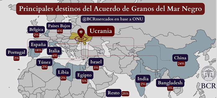 Sin embargo, estos volúmenes no se comparan con los 32 Mt de granos que se exportaron por el corredor en el último año. De no retomarse el acuerdo con Rusia y de ver sus exportaciones limitadas a través del Mar Negro, Ucrania se enfrentaría a un grave problema de comercialización de sus granos de exportación por vía terrestre, lo cual afectaría el abastecimiento de sus productos a nivel internacional. También afectaría a Ucrania en su frente interno puesto que los silos con el grano que no podrá exportarse deben empezar a liberarse para el ingreso de la nueva cosecha.