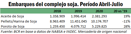 Por otro lado, en julio cayeron también los embarques de poroto de soja, luego de un álgido programa de embarques del grano en los primeros meses de la campaña. Así, en julio los embarques del grano sin industrializar cayeron un 23% en términos interanuales, aunque acumulan un crecimiento en lo que va de la campaña (abril-julio) del 28%.