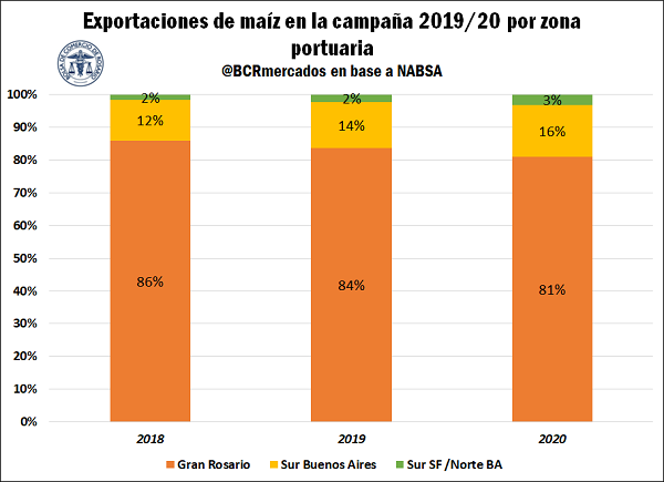 Así, las partidas desde los puertos ubicados en el Gran Rosario cayeron un 13% en términos interanuales, mientras que los embarques desde el sur de Santa Fe y norte de Buenos Aires (Ramallo, Zarate, Villa Constitución, entre otros) tuvieron un crecimiento del 284% en julio. Los embarques desde los puertos de Bahía Blanca y Necochea/Quequén prácticamente no presentaron cambios en relación al mismo mes de 2019.