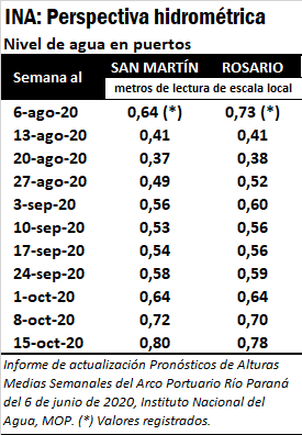 La altura del río Paraná volvió a resentirse en la última semana, luego de haberse mantenido cercana al metro en el hidrómetro ubicado en Rosario en el último mes. El día jueves 6 de agosto, el hidrómetro marcó 0,49 metros, la menor altura registrada desde finales del mes de mayo. El promedio semanal es de 0,79 metros, cayendo 0,46 m en relación al promedio de la semana anterior, y se encuentra 2,28 m por debajo del promedio de agosto desde 1995. El calado máximo permitido en los puertos de Rosario-Timbues era de 31’01’’ pies (9,48 m) para el día jueves (contra un calado normal de 34’).