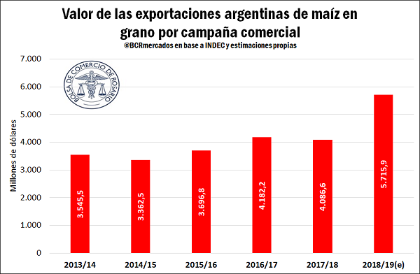 Las exportaciones de maíz habrían alcanzado un récord histórico mensual de 4,3 Mt en el mes de julio, según estimaciones preliminares del Departamento de Estudios Económicos de la BCR en base a datos de NABSA. La competitividad del cereal argentino en la plaza externa sustenta una revisión al alza de la proyección de ventas externas para la campaña 2018/19 a 34 Mt, un millón de toneladas por encima de lo estimado anteriormente y un 50% superior a los despachos de la campaña anterior. En base a una proyección de precios basada en los valores FOB oficial para embarques actuales y futuros, la exportación de maíz en granos podría dejar un ingreso de divisas por un total de US$ 5.700 millones en la campaña actual, 40% más que el año anterior y un 150% por encima del promedio de los últimos cinco años.