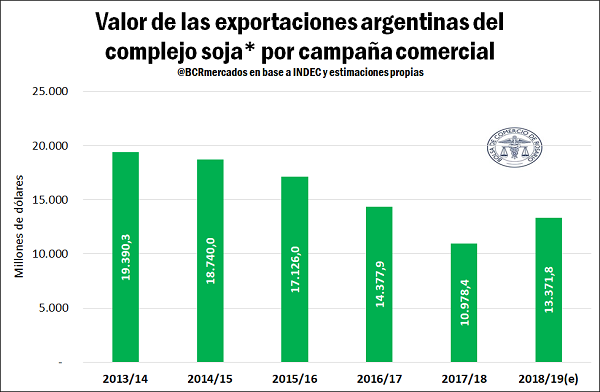 Del lado del complejo sojero* (tomando exclusivamente exportaciones netas de poroto de soja, harina y aceite) se prevén para la campaña 2018/19 despachos por 37,2 Mt, un 38% por encima del año anterior. Siguiendo la misma metodología para la proyección de precios de exportación, ello podría reportar un ingreso de divisas al país de US$ 13.400 millones, un 22% por encima del valor de lo exportado el año anterior y un 83% por encima del promedio de los últimos cinco años.
