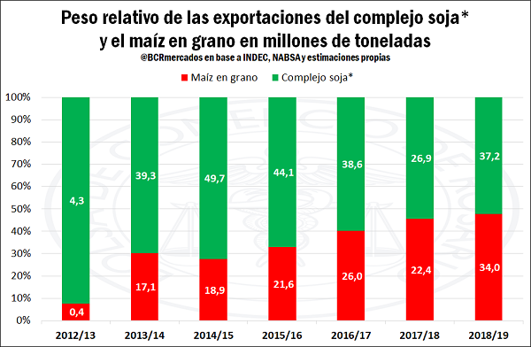 El aumento que registraron los embarques de maíz en el último lustro ha sido extraordinario. En los cinco años que van desde la campaña 2013/14 a la 2018/19 éstos se han duplicado, lo cual los acerca a igualar el peso de las exportaciones de los principales productos del complejo sojero en términos de volumen, tal como se muestra en el gráfico adjunto.