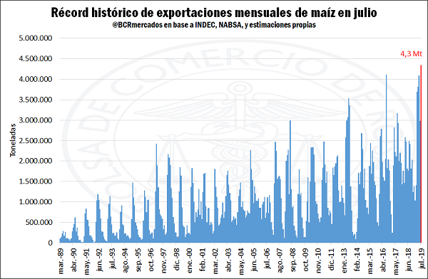 Como se mencionó al comienzo, las exportaciones de maíz del mes de julio habrían logrado alcanzar un récord histórico en torno a los 4,3 Mt, sobrepasando el máximo anterior de 4,1 Mt del mes de agosto de 2016.