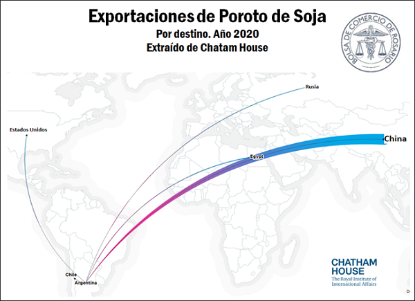 En 2021 la República Popular China fue destino de casi el 60% del poroto de soja que se exportó en Argentina. El gigante asiático consumía casi 27 Mt hace 20 años, alcanzando 60 Mt hace 10 años, y espera consumir en el mercado doméstico cerca de 112 Mt en la campaña 2021/22. Se debe destacar que, el alza de consumo interno en China no se verificó en un incremento productivo de la misma magnitud, lo que ha resultado en un incremento año tras año de la demanda de soja en los mercados internacionales, totalizando importaciones por 94 Mt en esta campaña, de acuerdo con el USDA.