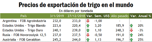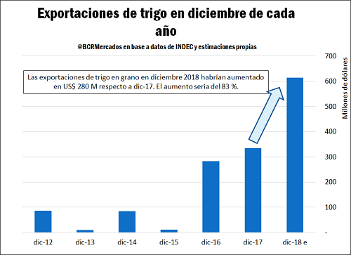 A un precio promedio FOB de US$ 228/t en el mes de diciembre las exportaciones de trigo en grano podrían alcanzar los 615 millones de dólares. Esto significa un aumento del 83 % respecto a igual mes del año pasado, que había ascendido a 336 millones de US$.