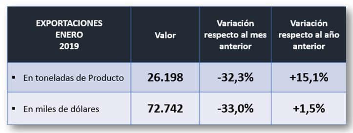 En enero de 2019 las exportaciones de productos lácteos fueron de 26.198 toneladas por un valor de US$ 72,7 millones, lo que representa una disminución del 32,2% y 33,0% respectivamente en comparación con el mes anterior y un incremento de 15,1% en volumen comparado con enero 2018 y +1,5% en valor para igual mes del año pasado. Se dio una importante caída en el volumen del Resto de Productos y en el valor unitario promedio de las exportaciones (-11,9%). Cabe acotar que en la comparación intermensual lo estamos haciendo con diciembre de 2018 que fue el más alto de los últimos 5 años para dicho mes.