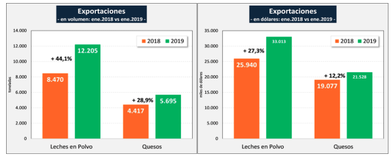 Los dos principales rubros de exportación, las leches en polvo y los quesos, tuvieron en enero de 2019 la evolución que muestran los gráficos comparados con igual mes del año anterior:
