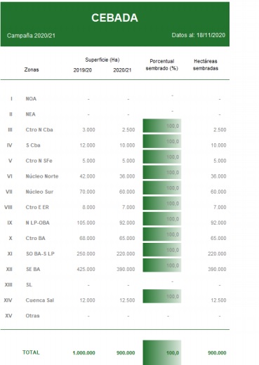 Las 900.000 Ha de cebada para la campaña 2020/21 se encuentra transitando la etapa de llenado de grano bajo una condición de cultivo entre buena y normal. Las expectativas de rendimiento a nivel nacional permiten mantener la proyección en 3.700.000 de toneladas. A la fecha, los cuadros más adelantados se ubican sobre el centro del área agrícola y podrían dar inicio a su recolección a lo largo de los próximos 7 días.