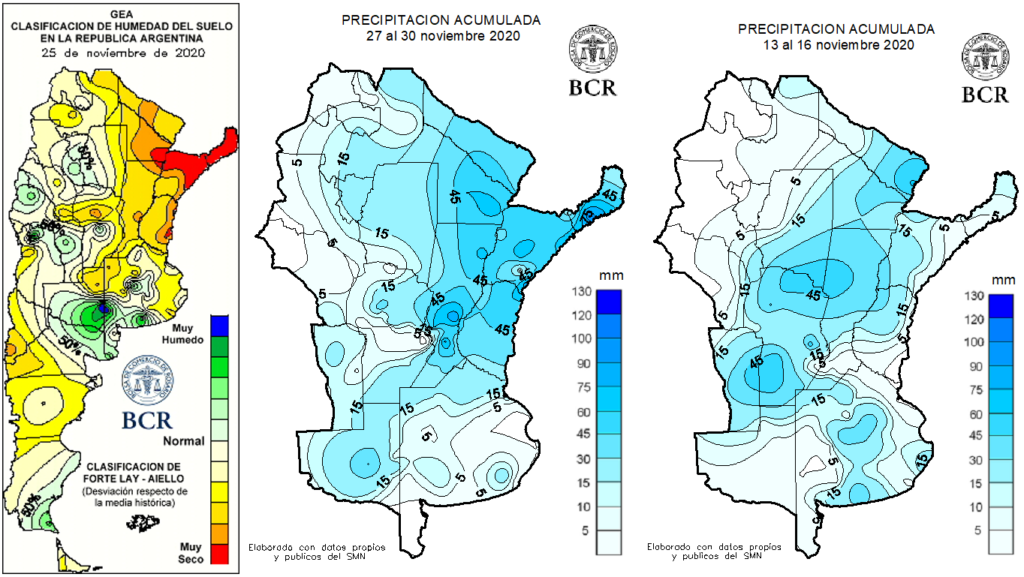 15 días después del alivio de las tormentas del 13 al 16 de noviembre, volvió a haber lluvias muy importantes. Y el evento fue bastante similar, aunque esta vez fue mayor el despliegue y el volumen de agua que recibió el norte y este argentino, las zonas más postergadas de este 2020. Los acumulados de la última semana muestran que en Chaco, Resistencia acumuló 120 mm, Roque Sáenz Peña, 70 mm, y en Misiones, Oberá alcanzó los 128 mm. Con esto parece haberse puesto en marcha la recuperación hídrica de las zonas que estaban en rojo con las reservas de humedad en Argentina. En la imagen de las lluvias acumuladas del 27 al 30 de noviembre, se observa que el evento dejó más de 45 mm en Santa Fe, Entre Ríos, Chaco, Corrientes y Formosa.