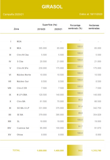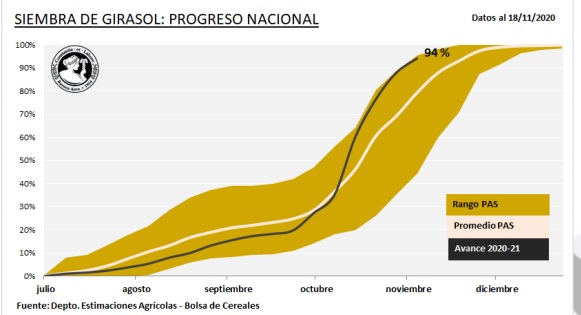 La siembra cubre el 94 % de las 1,4 MHa proyectadas para el ciclo 2020/21. El progreso intersemanal de las labores fue de 6,1 pp, y se mantiene un adelanto interanual de 5,5 pp.