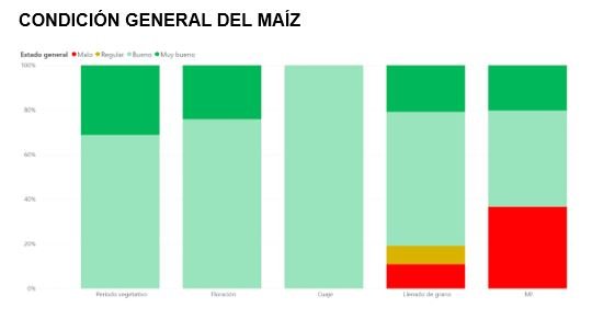 En este contexto, la empresa informó que los maíces de primera son los que mostraron una peor condición general. “Claramente estos valores tienen una correlación directa con la época de siembra. Los maíces de primera son los que tienen una peor condición, en tanto los sembrados más tarde son los que por ahora mostraron una mejor condición”, señalaron.