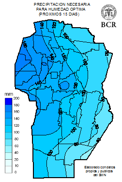 En el mapa se ve representada la precipitación que debería recibir la provincia en los próximos 15 días, (a inicios de octubre 2018) para alcanzar un estado de reservas de humedad del suelo óptimo.