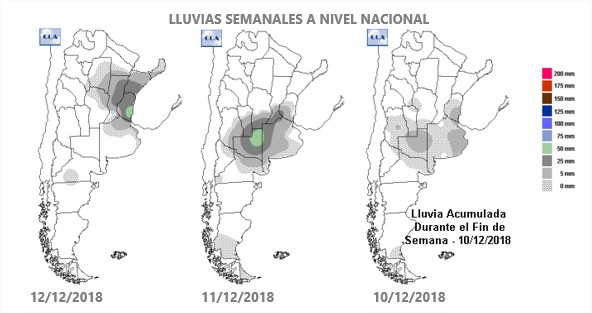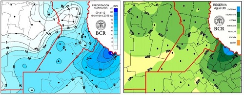 Acumulados por encima de los 80 mm recibió el noreste bonaerense del 9 al 12 de diciembre. Ramallo acumuló 89,4 mm y Pergamino 88 mm. La mitad de la región superó los 30 mm. Por fortuna, la tormenta esquivó el centro sur de Santa Fe, la zona que recibió los más de 300 mm en el mes de noviembre. El este cordobés es la zona con los menores registros, incluso en el centro de los departamentos de Unión y Marcos Juárez prácticamente no se registraron precipitaciones. En el sudeste provincial la humedad edáfica comienza a escasear. Para este jueves 13 y viernes 14 los pronósticos de lluvias intensas amenazan con dejar importantes milimetrajes en la región