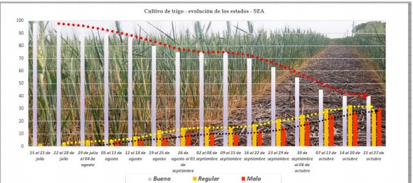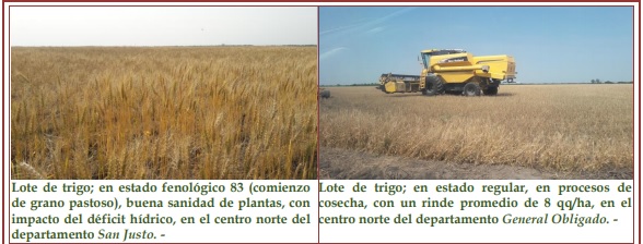 Ambientes muy secos, vientos, altos registros térmicos, conjuntamente con las precipitaciones, aceleraron e interrumpieron el llenado de grano, en un porcentaje medio de los cultivares. Pero, ante dicha situación se sumaron más lotes al proceso de cosecha, en distintos departamentos del área. Las lluvias se concretaron, los nuevos escenarios climáticos interrumpieron el período seco que afectó y condicionó la campaña de trigo, pero serían de muy baja incidencia en la recuperación de los cultivares, dado que en un bajo porcentaje se encontraban en etapa de inicio de llenado de grano, y no llegarían a capitalizar los mm de agua caídos. Un 60 % de los trigales continuaron en estado regular y regular a malo. No presentando inconvenientes en el aspecto sanitario, hasta el momento, pero concretándose cambios en el destino, según zonas de los diferentes departamentos del área de estudio. Tales como: confección de rollos para reserva, picado para consumo animal, particularmente en el área mixta (agrícola-ganadera) y aplicaciones de desecantes, interrumpiendo así el ciclo, destinándose dicho lote a otro cultivo.