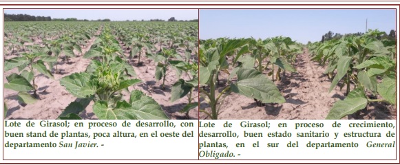 En general, los cultivares de girasol presentaron buen estado, pero algunos lotes puntuales evidenciaron carencia de agua durante su desarrollo. Las precipitaciones ocurridas en el período contribuirían y sumarían una mayor disponibilidad de agua útil en los suelos, cubriendo la demanda del cultivo, ya que en los próximos días ingresaría a los estadios reproductivos, sobre todo el comienzo de la floración. Además, se encontraron algunos predios con plantas de menor porte, menos desarrolladas y de irregular estructura, comparadas con las de la campaña pasada. Hasta el momento se observó muy buena sanidad, sin inconvenientes. Se detectaron los siguientes estados fenológicos; V “estados vegetativos”, V3 (3º par de hojas verdaderas), V4 (4º par de hojas verdaderas), V5 (5º par de hojas verdaderas), V6 (6º par de hojas verdaderas), V7 (7º par de hojas verdaderas), V8 (8º par de hojas verdaderas), V9 (9º par de hojas verdaderas) y en lotes puntuales, más avanzados, en comienzo de R “estados reproductivos”.
