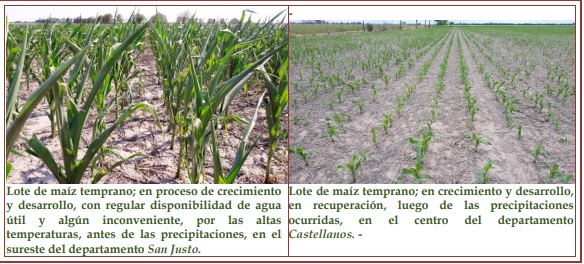 Sobre los primeros impactos en los cultivares de maíz temprano, que se observaron en el período anterior, tales como, acartuchamiento de las hojas y retraso en el desarrollo en altura de las plantas, las precipitaciones ocurridas revertirían dicha situación, posibilitando el desarrollo y crecimiento normal del cereal. Hasta la fecha los cultivares no presentaron inconvenientes con plagas, ni enfermadades. Se observaron los siguientes estados fenológicos: V “estados vegetativos”, V3 (3º hoja desarrollada), V4 (4º hoja desarrollada), V5 (5º hoja desarrollada), V6 (6º hoja desarrollada) y en lotes más avanzados, V7 (7º hoja desarrollada).