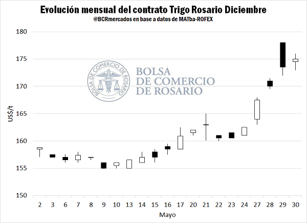A propósito de las perspectivas de precios para la próxima campaña, el futuro de Trigo Rosario Diciembre que pone piso al cereal nuevo, aumentó un 12% en las últimas cuatro semanas. En la última semana (jueves contra jueves), el contrato Diciembre ganó impulso incrementándose US$ 14,5/t desde el jueves 23. Como se puede ver en el gráfico, los futuros alcanzaron un máximo mensual e histórico para el contrato de US$ 178/t en la sesión de operaciones del miércoles, cerrando a US$ 175/t en la rueda del jueves.