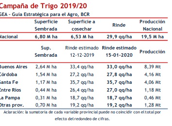 El final de la cosecha triguera afirma el récord productivo de 19,5 Mt Con el 100% de la cosecha terminada, se afianzan los rendimientos estimados. Se mantienen los resultados con un promedio nacional de 29,9 qq/ha, aunque seguirán las revisiones. Hubo algunos cambios menores de rindes: Buenos Aires se ajustó con una pequeña baja por los pobres resultados del suroeste. Pero los mejores resultados de Córdoba y Entre Ríos contienen la caída, siguiendo los resultados del SIBER de la Bolsa de cereales de Entre Ríos. Por consiguiente, se afirma la producción récord de trigo 2019/2020 con 19,5 M Tn.