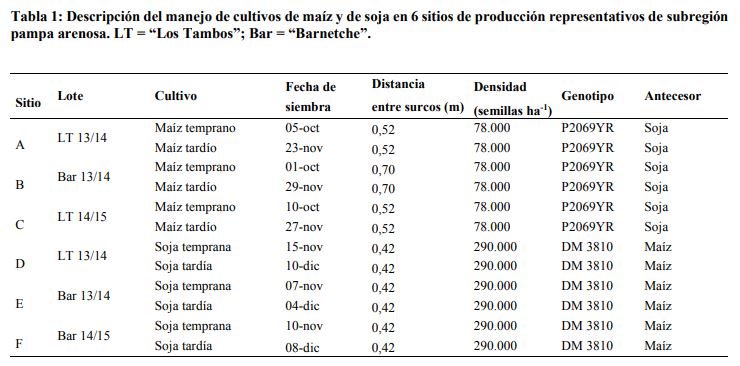 En las campañas 2013/14 y 2014/15, se condujeron 6 estudios, 4 durante la campaña 2013-2014 y 2 durante la 2014-2015 en dos establecimientos del centro de la provincia de Buenos Aires (Argentina): “Don Domingo y Doña María Barnetche” (Bar) (36° 08′ 46″ S, 61° 04′ 26″ O) y “Los Tambos” (LT) (36° 07′ 52″ S, 61° 30′ 12″ O) bajo prácticas agrícolas en siembra directa representativas de sistemas agrícolas de la subregión pampa arenosa. El manejo de los cultivos de soja y maíz se detallan en la Tabla 1.
