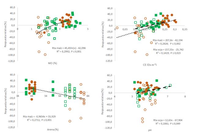 Figura 1: Relación entre la respuesta relativa al fertilizar con fósforo en lotes de maíz y de soja en 62 sitios de la subregión pampa arenosa según materia orgánica (MO), conductividad eléctrica (CE), arena, pH, índice de materia orgánica (IMO), e índice ambiental (IA) . Círculos llenos= maíz alta productividad, círculos vacíos= maíz baja productividad, cuadrados llenos = soja alta productividad, cuadrados vacíos = soja baja productividad.