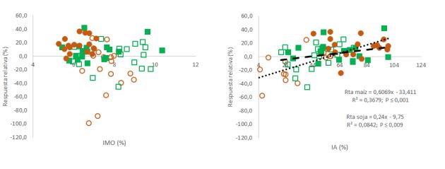 Se observó una relación lineal positiva entre la respuesta al agregado de P y el pH en el cultivo de soja (R2= 0,11, p< 0,001), mostrando esta valores de respuesta positivos a partir de 5,37. No se observó relación entre la respuesta al agregado de P y el pH en el cultivo de maíz. La relación entre el pH y la productividad del cultivo de soja, ha sido descripta por otros autores. La acidificación no sólo acarrea deficiencias de nutrientes básicos, sino que también produce perjuicios como la reducción de la disponibilidad de P y MO, la actividad de microorganismos responsables de la nitrificación y fijación simbiótica de N, y hasta toxicidad de Al, en situaciones donde el pH es menor a 5,5 (Vázquez et al., 2010). En un estudio realizado en suelos de la provincia de Buenos Aires y Santa Fe, el agregado de enmiendas básicas en suelos de moderada a fuerte acidez actual ubicados en, aplicadas entre 15 días y 1 año previo a los cultivos, produjo incrementos de rendimiento de soja que oscilaron entre 209 y 1264 kg ha-1 (Vázquez et al. 2012). La respuesta al agregado de P en función del IA, mostro una correlación positiva para ambos cultivos, ajustándose a una función lineal. En el cultivo de maíz (R2= 0,37, p< 0,0001), la respuesta se vuelve positiva con un valor de 55,5 % de IA, mientras que para soja la respuesta se vuelve positiva con un valor de 40,6 % de IA. (Figura 1).