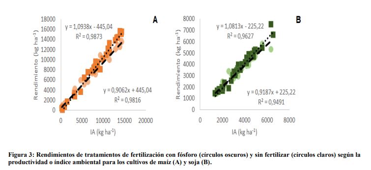 En el cultivo de maíz, con el aumento del índice ambiental aumenta de manera más que proporcional el rendimiento de los tratamientos fertilizados, con respecto a los sin fertilizar (p <0,0001), a partir de un rendimiento de 5291 kg ha-1 . Esto indica que la respuesta a la fertilización con fosforo en el cultivo de maíz aumenta a medida que el potencial del sitio es mayor (Figura 3 A). Al igual que para maíz, para el cultivo de soja, el aumento de rendimiento de los tratamientos fertilizados, aumenta en mayor medida que los tratamientos sin fertilizar a mayor IA (p <0,05), a partir de un rendimiento de 2770 kg ha-1 (Figura 3 B).
