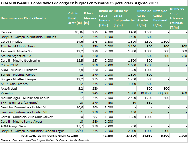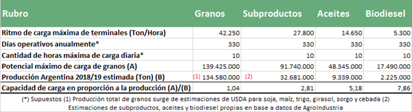 Todas las terminales relevadas cuentan con capacidad para la carga de granos sin industrializar, salvo por las plantas de Arauco en Puerto General San Martín y la de Akzo Nobel en San Lorenzo, que se utilizan exclusivamente para la carga de aceite y biodiesel (en el caso de Arauco, también se emplea para la carga de glicerina refinada). En cuanto a la planta con mayor capacidad de carga de granos tenemos a la de Renova en Timbúes, con capacidad de carga de 4.000 toneladas por hora, que también es la de mayor capacidad de carga de harinas/subproductos, con una capacidad teórica de carga de 3.400 ton/hora.