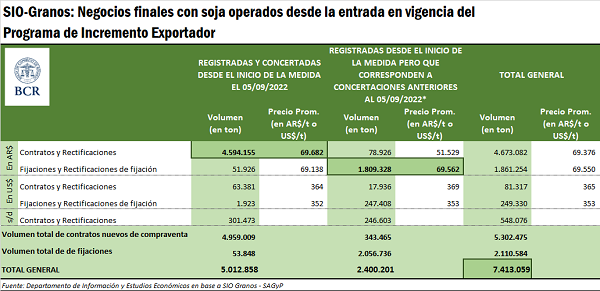 Entre el 5 y el 15 de septiembre, en coincidencia con la vigencia del Programa de Incentivo Exportador (PIE) que permite liquidar las exportaciones del complejo soja a un tipo de cambio de AR$ 200/US$ durante el mes de septiembre, se realizaron operaciones finales con soja por un total de 7,4 millones de toneladas. Éstas reflejan las operaciones realizadas por industriales y exportadores de soja o, en otras palabras, los usuarios finales del grano. De este total, 5,3 millones de toneladas corresponden a operaciones nuevas de compraventa y 2,1 millones de toneladas a fijaciones.