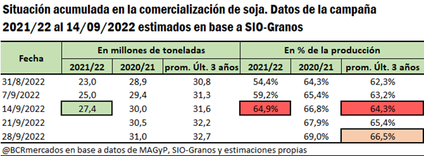 2) Se estima que el impulso a la comercialización deja las compras totales de industriales y exportadores al día miércoles en 27,4 millones de toneladas. Con relación a la producción de soja 2021/22, ello alcanza el 64,9% del volumen total, superando el promedio de los últimos 3 años y dejando atrás el retraso de las ventas que se observaba en agosto.