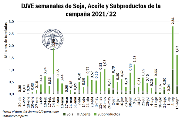 Sólo entre el lunes 12/9 y el jueves 15/9 de la semana en curso, el registro de ventas externas del complejo asciende a 1,63 Mt, constituyendo así el tercer mayor volumen semanal de ventas externas de productos de la actual campaña. Aun faltando los datos del día viernes para completar la semana, se puede apreciar que el dinamismo en cuanto a las ventas externas se mantiene elevado durante la segunda semana desde la entrada en vigencia del PIE.