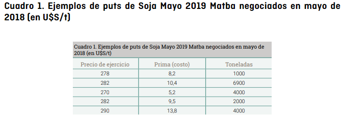 Por ejemplo: en el mes de mayo de 2018 se negociaron puts (opciones de venta) de Soja Rosario Mayo 2019 por un volumen de 52.600 toneladas. No se trata de una cifra muy elevada, pero indica que hubo algunos empresarios que, en ese contexto incierto, aprovecharon esa oportunidad de cobertura. Por entonces se operaron, por ejemplo, puts a un precio (prima) de 5,2 U$S/tonelada con un precio de ejercicio de 270 U$S/tonelada (es decir: con un precio de cobertura efectivo de 264,8 U$S/tonelada en mayo de 2019). De esta manera, lo que parecía a todas luces ser una opción cara en su momento (520 dólares por cada contrato de 100 toneladas de soja del Matba), terminó siendo una jugada magistral (ver cuadro 1).