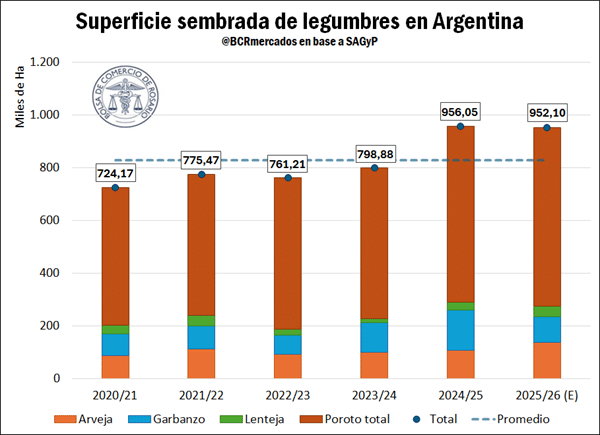 En términos estructurales, el poroto continúa siendo la principal legumbre del país, representando en promedio el 72% del área sembrada en las últimas cinco campañas. Le siguen garbanzo y arveja, con el 12% cada uno, y finalmente la lenteja, con cerca del 4%.