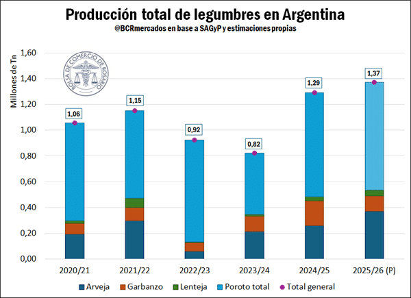 El sector de legumbres argentino atraviesa un momento de fuerte expansión productiva. Para la campaña 2025/26, la producción nacional podría alcanzar 1,37 millones de toneladas, el mayor volumen registrado al menos en los últimos cinco años.