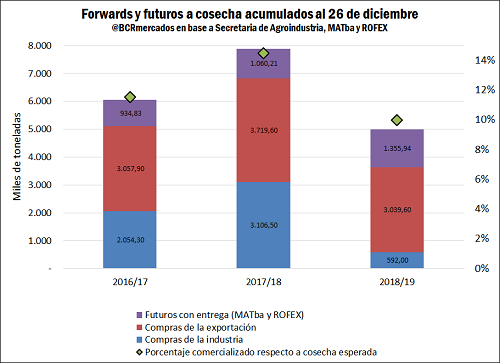 En relación a las 50 Mt que se esperan cosechar según la Guía Estratégica para el Agro de la BCR, se lleva comercializado cerca de un 10 % de la producción entre forwards y futuros, mientras que en diciembre del año pasado ese ratio alcanzaba el 14,5 %. Cabe aclarar que en ese momento la producción esperada era de 54,5 Mt, ya que la sequía todavía no se había hecho presente.