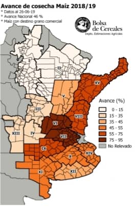 Sobre la provincia de Córdoba, los avances de cosecha son dispares; mientras que hacia los departamentos del norte la recolección avanza sobre cuadros tardíos, hacia el este las lluvias demoran las labores. En la zona Centro-Norte de Santa Fe, el rinde medio se ubica en 78,2 qq/Ha luego de cosecharse casi 100.000 Ha del cereal. En la zona del NOA, la elevada humedad de parte de los cuadros solo permitió un avance intersemanal de puntos porcentuales.