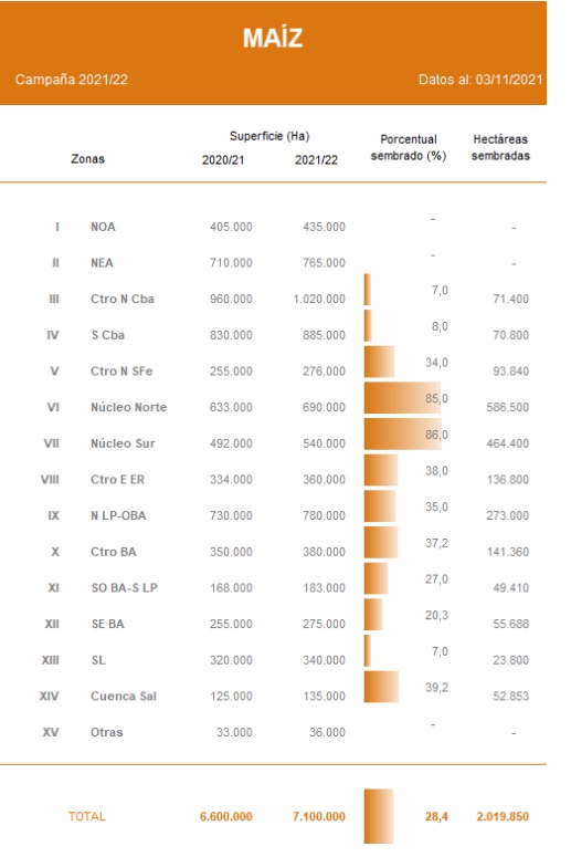 Desde nuestro informe previo, la incorporación de planteos de maíz con destino grano comercial se concentró en el sur del área agrícola nacional. La mejora en la humedad del suelo registrada los últimos días, permite afianzar los avances y mantener el estado de los lotes ya emergidos. Luego de relevar un progreso intersemanal en las labores de solo 0,8 puntos porcentuales, el avance nacional de siembra se ubica en el 28,4 % de las 7,1 MHa proyectadas para la campaña 2021/22.
