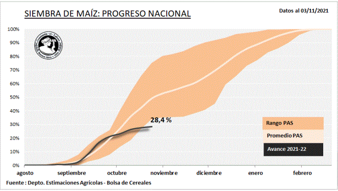 La siembra del cereal ya cubre el 28,4 % de la actual proyección de 7,1 MHa para el ciclo 2021/22, que representa una expansión interanual de 7,6 %. Los avances registran una demora entre campañas de 2,5 pp.