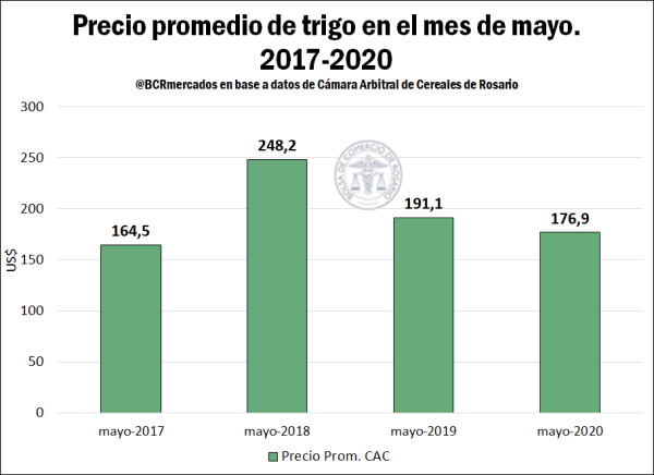 Si se observan los precios promedios para el trigo en el mes de mayo, no se logró un repunte de las caídas iniciadas a fines de abril, obteniendo un valor medio de US$ 176,9/t. De esta forma, dicha cotización no solo se encontró muy por debajo del máximo alcanzado el 22 de abril de US$ 197,6/t sino que de los precios promedios en las dos últimas campañas previas. Actualmente, la cotización de la Cámara Arbitral de Cereales (CAC) para los negocios efectuados la jornada de ayer alcanzó los US$ 176,1/t.