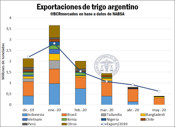 Por su parte, Estados Unidos envió 1,8 Mt de trigo al 28 de mayo, según los datos de inspección de exportaciones de granos del Departamento de Agricultura de Estados Unidos (USDA). Las exportaciones de mayo están cerca de los niveles promedio de 5 años, pero muy por debajo del récord de 3 Mt del mismo momento en el año previo.
