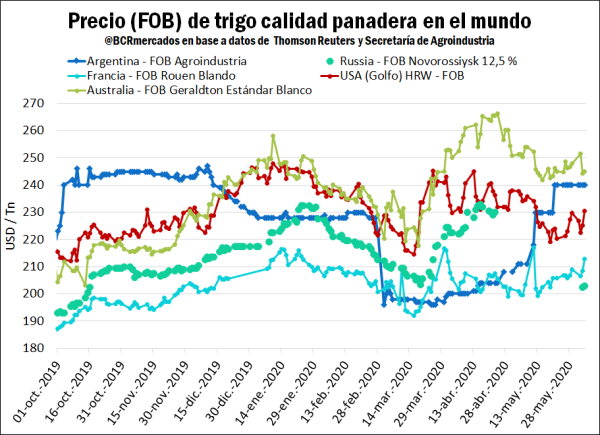 Considerando los precios FOB de los distintos orígenes, Argentina viene detentando alzas en su precio oficial desde fines de abril alcanzando los US$ 241/t en la actualidad. Dicho valor, se encuentra solo por debajo del trigo australiano, mientras que los principales exportadores europeos e incluso Estados Unidos, detentan valores sustancialmente menores. De esta forma, Argentina con dichas cotizaciones pierde competitividad y queda fuera de los mercados más distantes, lo cual se verifica con los menores volúmenes de exportación en los últimos meses. No obstante, el grueso de las ventas externas ya se ha realizado y aún tiene posibilidades de colocar el trigo remanente en destinos más cercanos como Brasil, Chile o Perú principalmente.