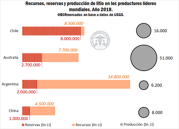 Tal como se evidencia en el gráfico, la cantidad de reservas no garantiza una producción proporcional. Con el 14% de las reservas mundiales de litio, Argentina genera el 7% de la producción mundial; mientras Chile, con el 57% de las reservas produce el 19% del total; y Australia, que posee el 19% de las reservas identificadas nuclea el 61% de la producción global.