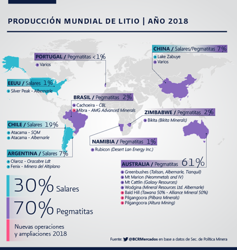 Australia, Zimbabue, Brasil, China y Portugal son los principales países productores de litio a partir de yacimientos rocosos, mientras que Argentina, Chile, China y Estados Unidos lideran la nómina de productores del metal a partir de depósitos en salmueras.