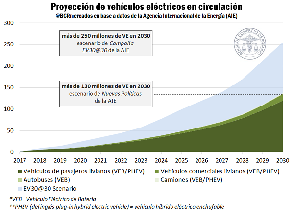 En una segunda proyección, la AIE empleó el escenario más optimista denominado EV30@30. El nombre del escenario hace referencia a la campaña que impulsa la Agencia en apoyo al incremento de vehículos eléctricos que se alinea con las políticas y proyectos locales de cada país. El principal objetivo cuantitativo de la campaña EV30@30 es que las ventas de vehículos eléctricos representen el 30% del total de ventas de rodados en el año 2030. En este escenario la AIE proyecta un parque automotor de alrededor de 100 millones de VE en 2025 y más de 250 millones en 2030.