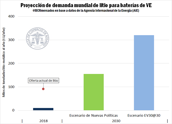 Reafirman estas proyecciones las cifras publicadas por BBVA Research, en Informe Energía y Materias Primas: “Litio y cobalto. Mismo propósito, diferentes caminos” (2018), la demanda de litio podría pasar de 52.894 toneladas métricas (Li) en 2018 a 286.072 en 2030.