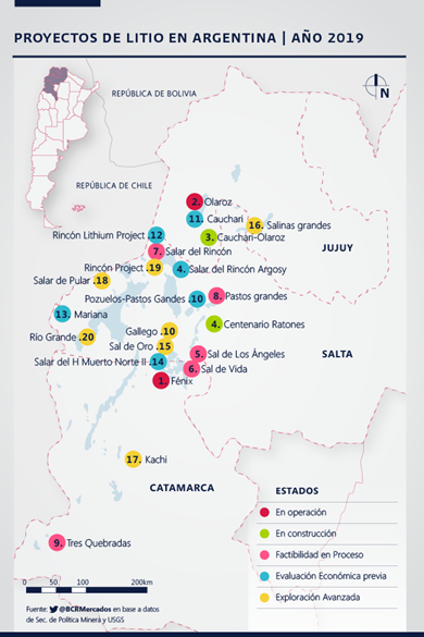 Actualmente en Argentina existen proyectos para explotar litio en 23 salares ubicados en el territorio de Jujuy, Salta y Catamarca. De estos proyectos, Olaroz en la provincia de Jujuy y Fénix en Catamarca, son los únicos que ya se encuentran en fase productiva. Fénix es operada por la estadounidense Livent Corp (perteneciente a FMC), y cuenta con una capacidad instalada de 22.000 t LCE. Olaroz está a cargo de la minera australiana Orocobre, la japonesa Toyota y la nacional JEMSE (Jujuy Energía y Minería Sociedad del Estado), y actualmente su capacidad instalada es de 17.500 t LCE. Además las dos minas cuentan con planes de expansión para alcanzar la capacidad instalada de 40.000 t LCE cada una, en el caso de Olaroz se espera llegar a este objetivo en 2020 y en la mina Fénix en 2022.