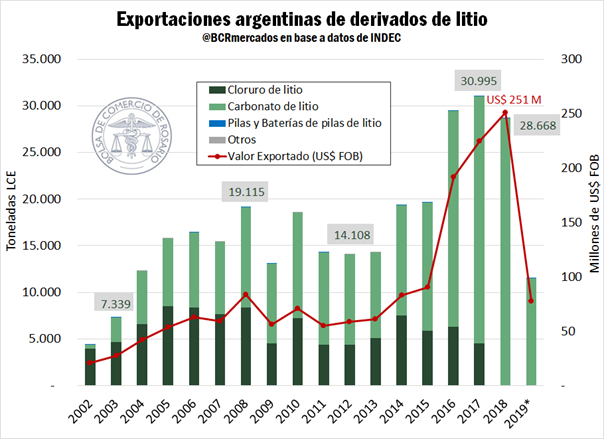 En 2018 las exportaciones argentinas de litio y derivados ascendieron a 28.668 toneladas LCE, un 8% por debajo de las del año anterior pero un 26% por encima del promedio de los últimos 5 años. Gracias a la apreciación del litio a nivel mundial, el volumen de las exportaciones del sector alcanzó un máximo en 2018 del orden de los US$ 251 millones, más de US$ 26 millones más que en 2017.