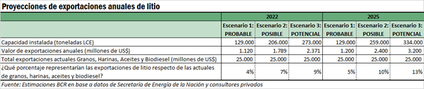 Partiendo de los tres escenarios propuestos por la Secretaría de Política Minera dependiente del Ministerio de Producción y Trabajo, se obtienen proyecciones de exportaciones de litio para los años 2022 y 2025.