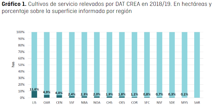 La región CREA Litoral Sur es la que presentó en la campaña 2018/19 la mayor cantidad nominal y relativa de cultivos de servicio con más de 8000 hectáreas sembradas, las cuales representaron el 11,6% del total del área agrícola del período.