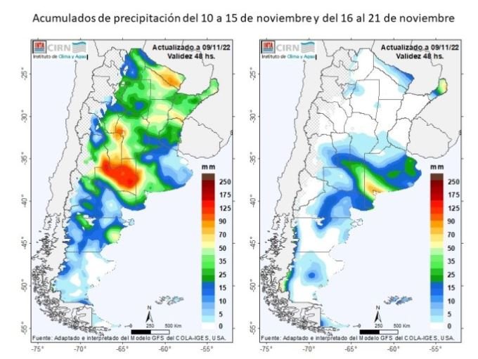 En ese contexto negativo para la producción, se espera la llegada de un alivio con un sistema de lluvias en los próximos días. “Los modelos anuncian altas chances de eventos de lluvias a partir del jueves y, en algunas zonas, con milímetros significativos para todo el centro y norte del país”, afirmó Pablo Mercuri, director de Centro de Investigación de Recursos Naturales (CIRN) del INTA. En esa línea, agregó: “En el centro oeste de la región Pampeana podrían ser de más intensidad y se extenderían hasta el domingo y lunes”.